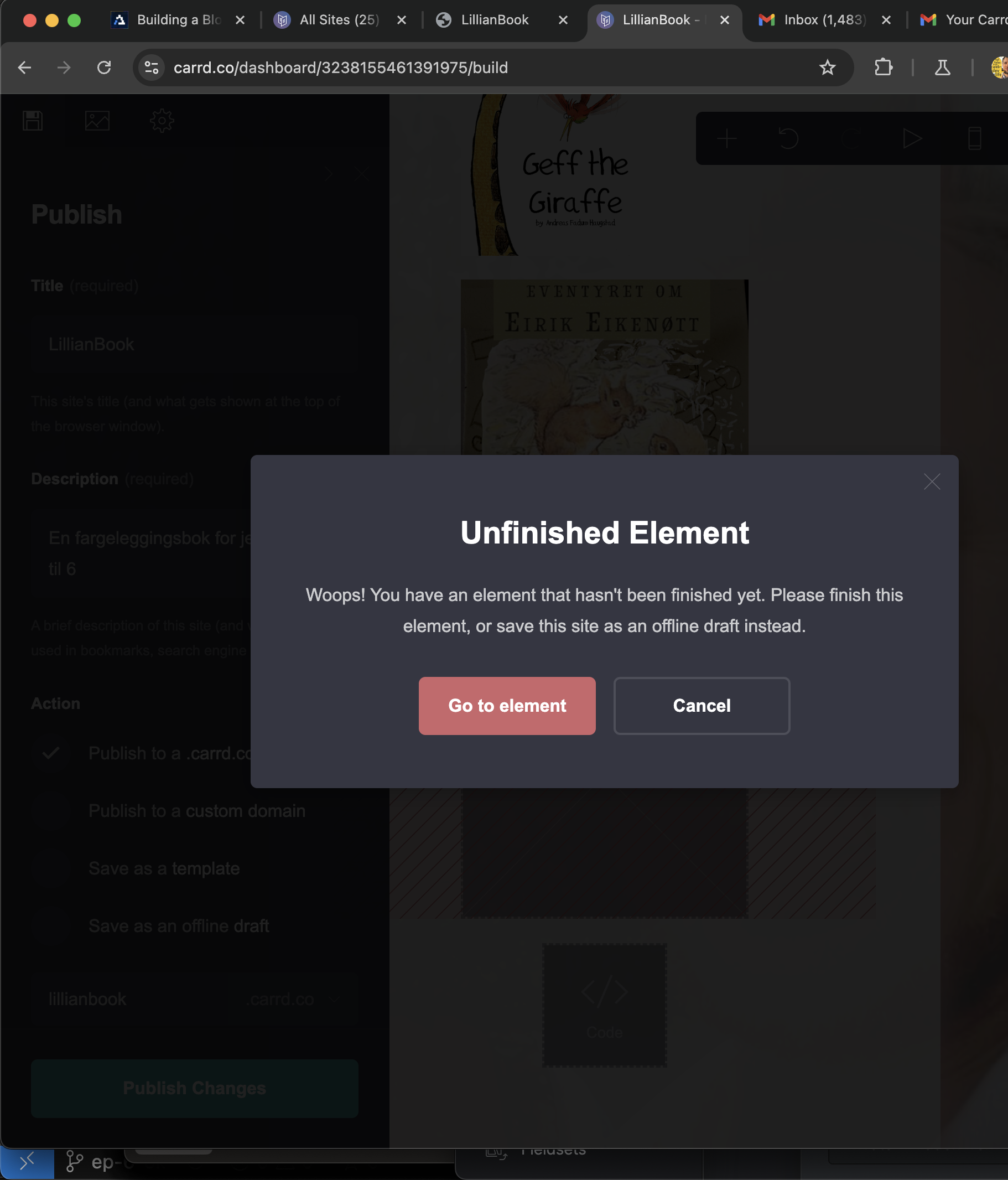 This is where I hit my first rock right under the surface of the sea. I tried to publish my changes, but Carrd said no.